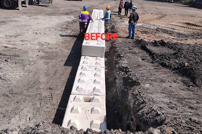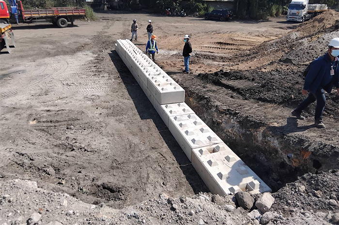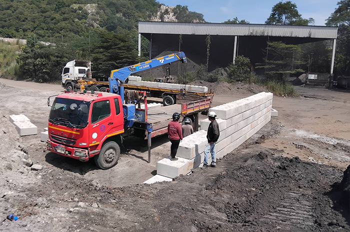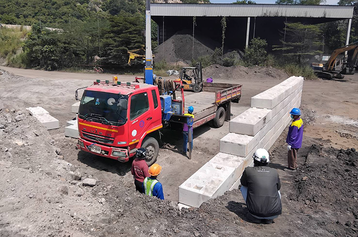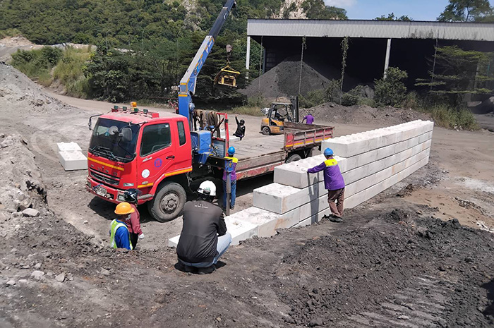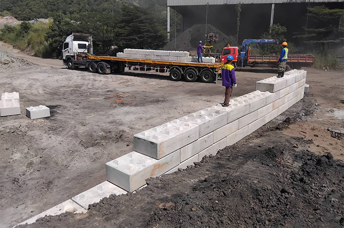 Block are the ideal solution for the construction of storage bays, retaining walls, bunkers, partition walls, fire resistant walls, factory halls, industrial work spaces, traffic safety & guidance, waste separation areas, (temporary) road blocks, and many more. And with a special sealant it is even effectively holding water mass from rivers and sea, making it an ideal solution against flooding and for creating boat docks, in and outlet points for boats, etc. Thanks to its durability and flexibility, these blocks offer a highly cost-effective solution.