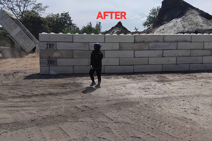 Example: if you build a 2m high wall, the ‘normal’ brick wall will cost 3500 baht per meter (2m high). The TBP Block wall will cost 7000 baht per meter (2m high). So while the TBP Block wall is 6,5x THICKER, you only pay 2x THE PRICE of a ‘normal’ wall. And the TBP Block wall is also 20x STRONGER than a ‘normal’ wall.